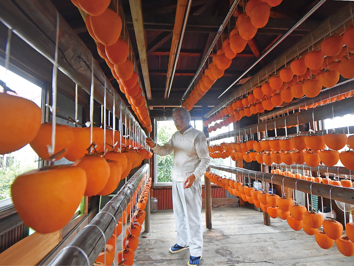 鈴木信一さん(78)が干し柿を始めたのは定年を迎えるころ。かつて両親が美しい干し柿を作っていたことを思い出し「増やしてみよう」と数十本の苗を植えたのがきっかけ。「以前はどこでも自家用に作っていましたよ」と鈴木さん。干し柿になるのは「蜂屋柿」や「甲州百匁柿」などの渋柿で、例年たわわに実をつける。