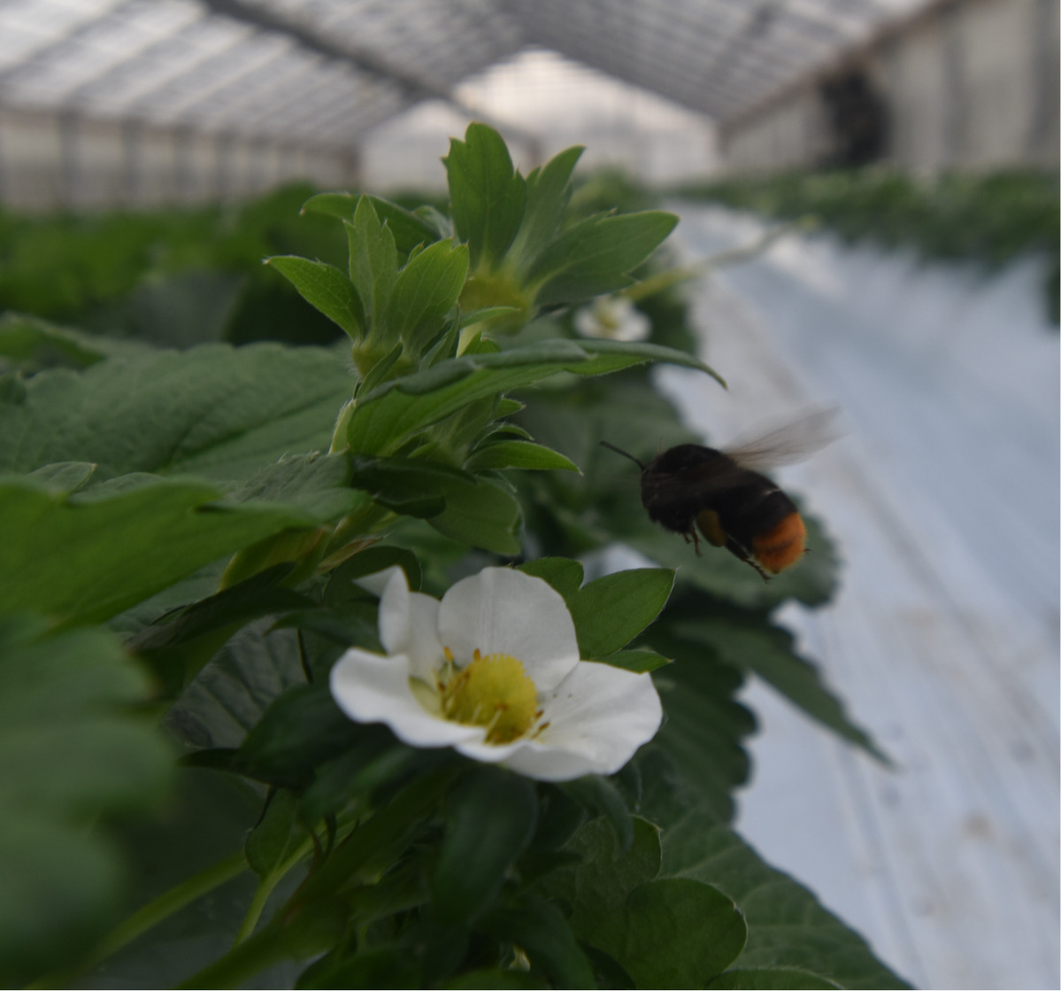 ハウス内で栽培しているのは約6千株の「とちおとめ」。深みのある甘さが特長で、いずれ実となる白い花が点々と開花している。蜜を集めるミツバチが使われることもあるが、武井哲也代表が放っているのは黒い個体のマルハナバチ。低温に強いハチで花粉を食べて花々をまわっている。天気が良いと活発に飛び、1匹で800ほどの花を受粉させるためハウス一棟分なら数匹でまかなえるという。巣箱には数個の穴が開いており、開花状況に合わせてハチの数を調整する。