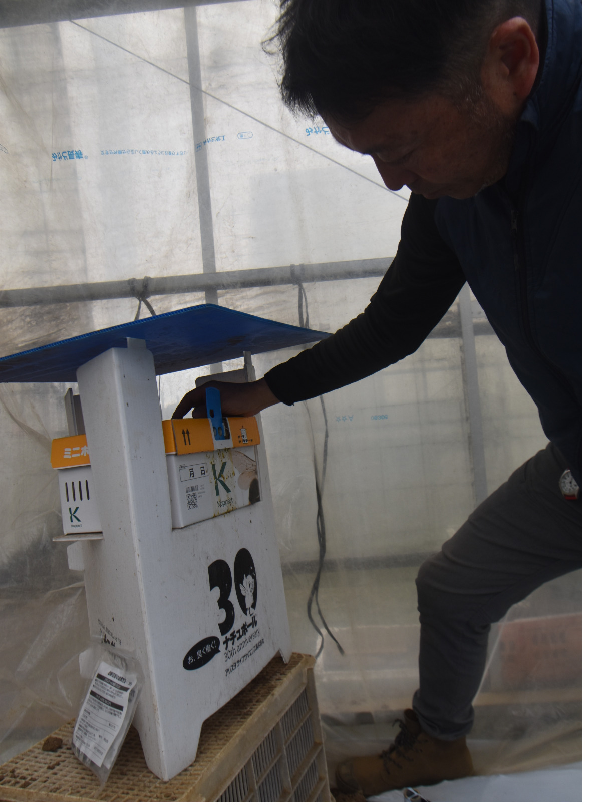 海老名市本郷の武井いちご園で、このほど受粉用のハチが飛び始めた。