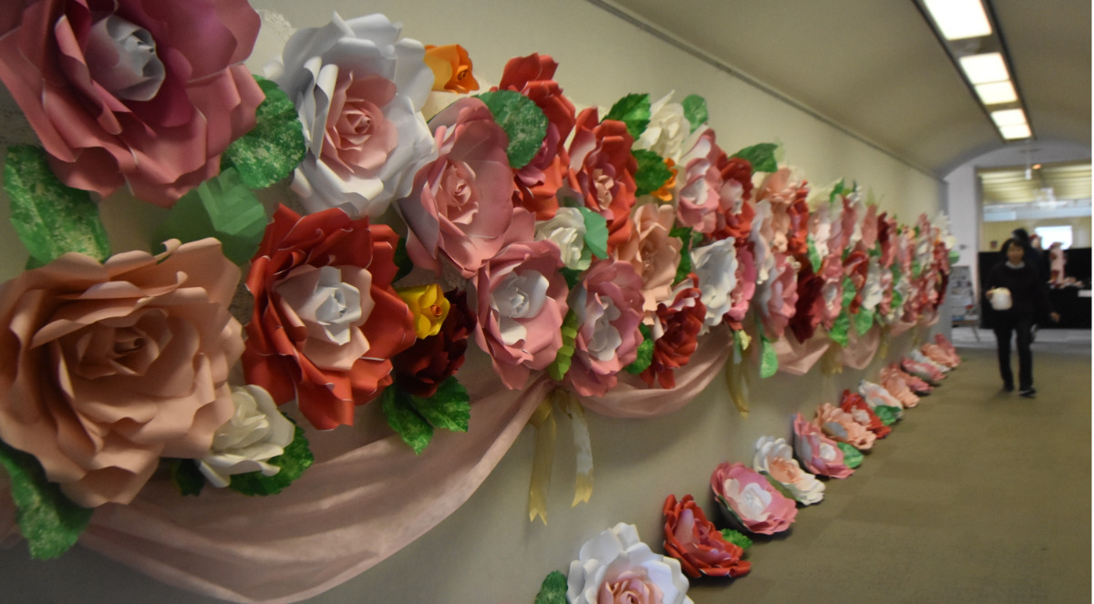 NPO法人ふるさと環境市民と市みどり公園課が「バラの街づくりを応援しよう」と初企画したイベント。バラにちなんだステンドグラスや紙製の造花など、市民から募った80作品を展示、450人が来場した。会場への通路の壁には紙のバラが満開になり、撮影スポットになっていた。
