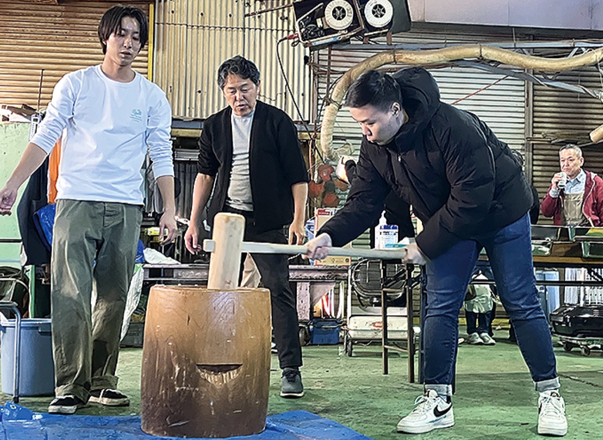 綾瀬市で海外出身者に向けた日本語教室に取り組む「あやせ未来塾」(渡邉誠一代表)は、11月30日に課外授業「餅つきで国際交流を!」を吉岡工業団地の(株)栄和産業敷地内で開いた。