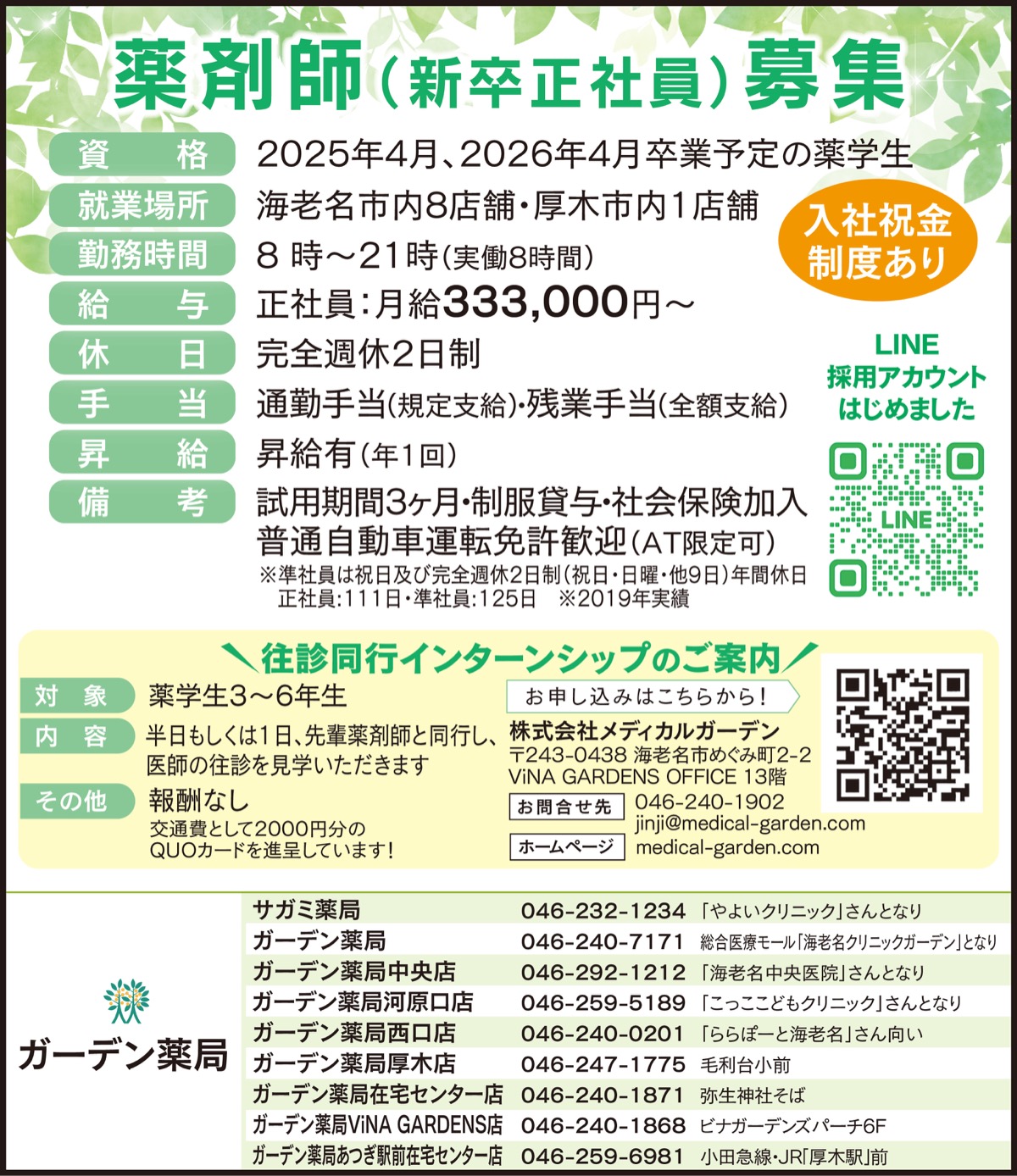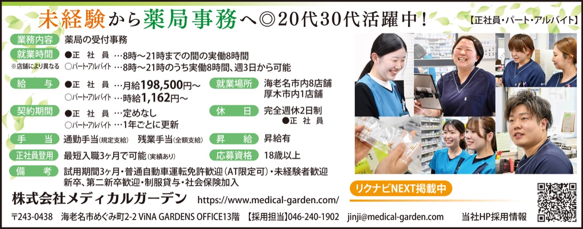「海老名市に恩返ししたい」―。株式会社メディカルガーデン(小林弘忠代表取締役)は、同市を中心に9店舗の調剤薬局を展開している。同社では、「地域の医療と健康」を担う人材を積極採用している。