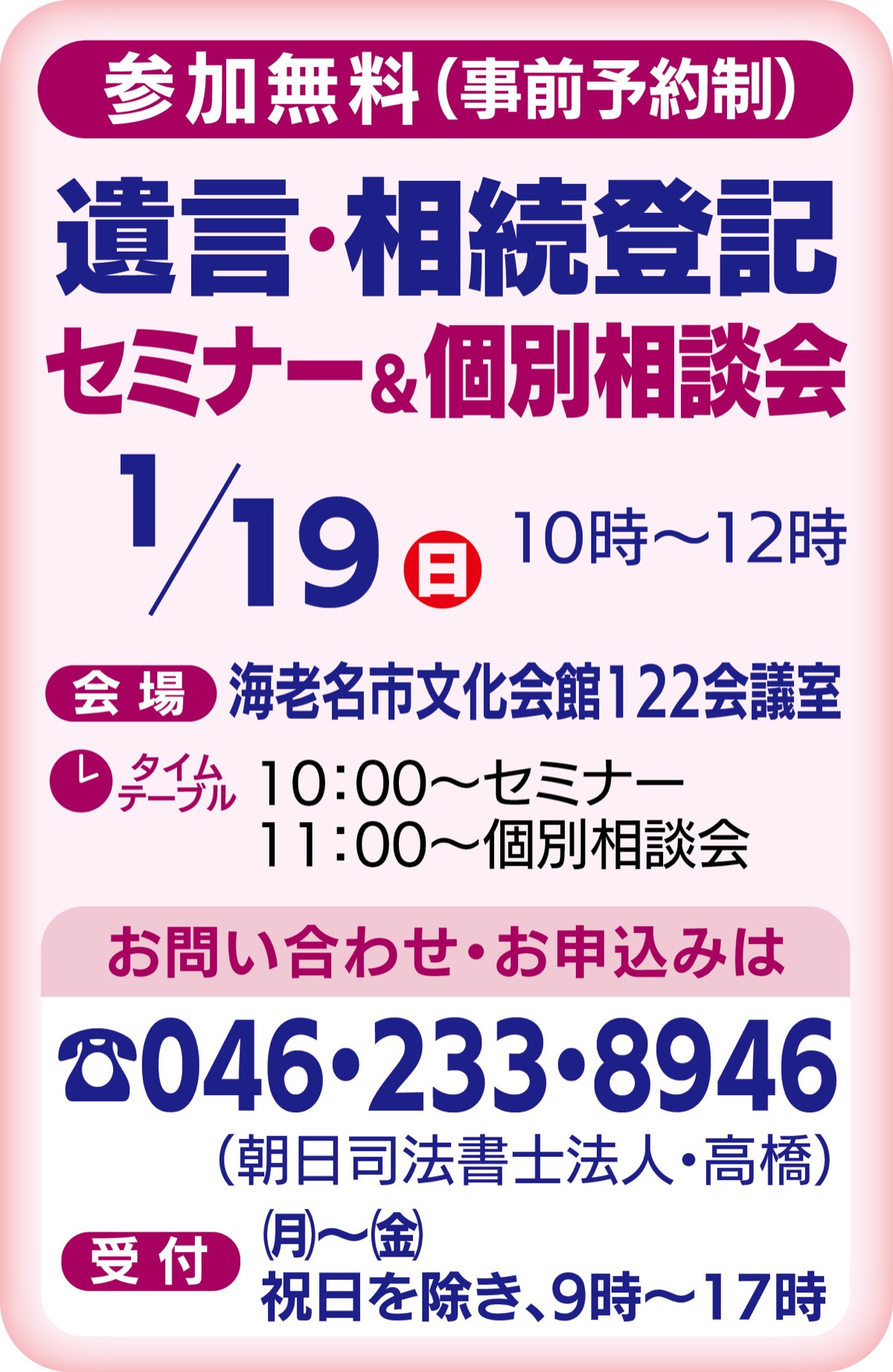 県司法書士会厚木支部は1月19日(日)、遺言や相続について学ぶセミナーと相談会を海老名市文化会館で開催する。午前10時から。事前予約制で参加無料。