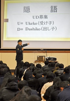 綾瀬高校で1月9日に闇バイトから身を守るための講演が開かれ、取調べなどを担当した大和署生活安全課の松本大輔さんが注意を呼び掛けた。