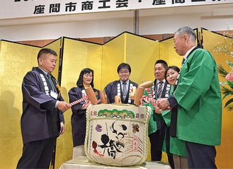 式典では鏡開きも行われ、熊切和人議長や芥川薫県議など来賓も登壇し、掛け声を合わせて商売繁盛を祈念した。