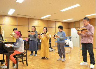 同財団は昨年12月から、作曲家の池辺晋一郎氏の指揮で歌うとして海老名や座間、綾瀬市から合唱団員を募集。練習初日となったこの日は、5人が参加し、ピアノの音に合わせてコンサートで披露する平和祈願の混声合唱曲「悪魔の飽食」を練習した。