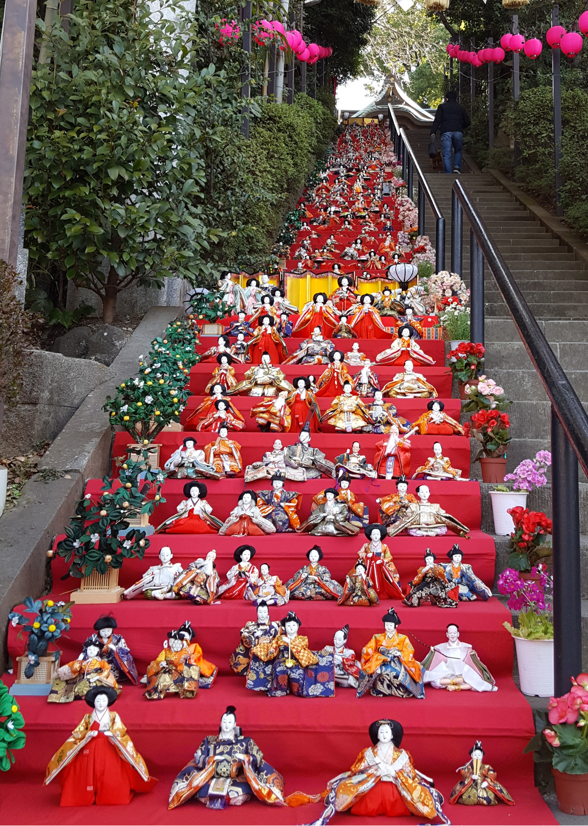 座間神社(山本俊昭宮司)で3月1日(土)から3日(月)まで、春よこいひな祭りが開催される。期間中は同神社の本殿に続く77段の石段に並んだ千体のひな人形が出迎える。本殿の周りでは、七段飾りや吊るし雛などが展示される。午前10時から午後6時30分まで。