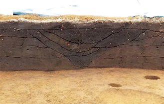 調査は宅地造成の一環で一昨年から昨年にかけて行われ、その断面から溝の幅は2mほどと分かった。全体の長さや詳細な年代は不明だが、離れた場所でも同様の溝が見つかり、続いている可能性もある。一帯は見晴らしがよく、中尾遺跡では縄文期の住居跡も見つかった。奈良・平安時代の遺構は初で、市生涯学習課では「驚いている。農業用の溝か、屋敷と畑を分ける溝なのか、調査が進めば手がかりが出るかもしれない」と話す。