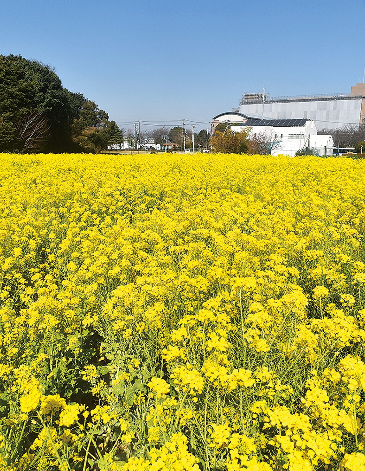 綾瀬市役所から県道42号を南側に歩いた農地が菜の花畑となり、視線を集めていた(=3月21日撮影)。小さな蜂が飛び交い、三脚にカメラを構える人やスマートフォンで撮る人も。菜の花は農業では畑にすき込む緑肥としても使われる。