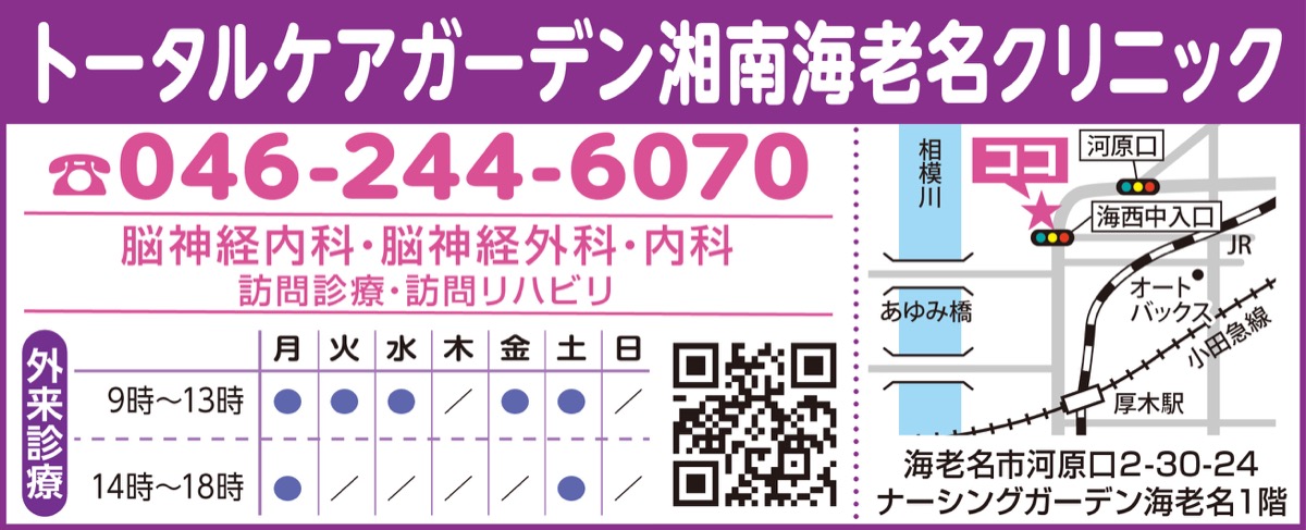 脳神経疾患から内科疾患まで、幅広く対応するトータルケアガーデン湘南海老名クリニック(西山淳院長・海老名市河原口)が4月1日から常勤医師が2人体制となり診療体制を強化、外来診療と訪問診療の提供日が拡大した。