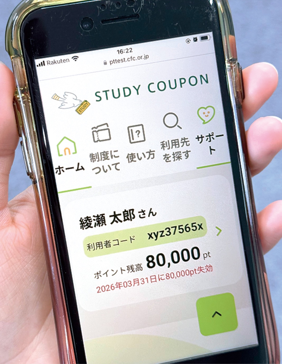 生活保護や就学援助を受ける世帯の3年生が対象で、最大8万円の学習塾用クーポンが使える。専用サイトでポイントの利用手続きを行い、生徒自身がまとめで使ったり、分けて活用するなど、アレンジできるのも特長のひとつ。近隣市の塾や通信教育を含む52教室で使うことができる。