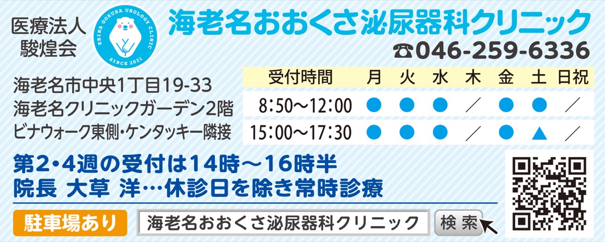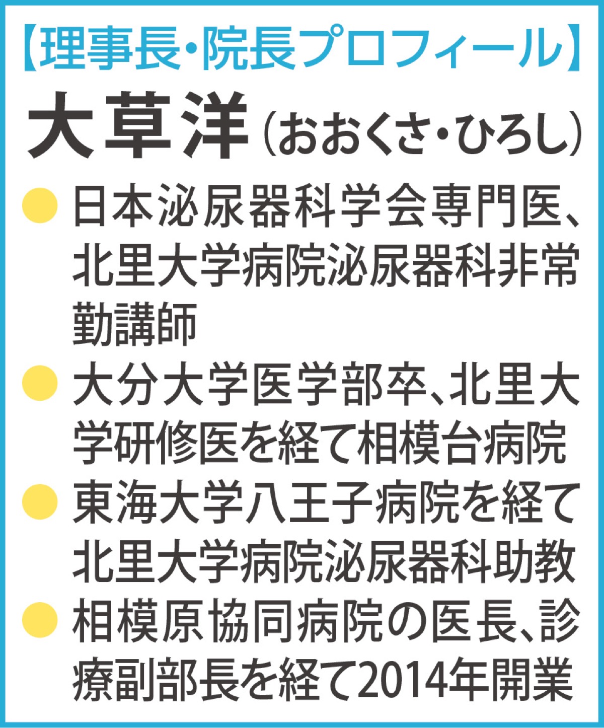 海老名クリニックガーデン2階の海老名おおくさ泌尿器科クリニックは今年4月に体制を一新し、運営法人の大草洋理事長が院長に就任した。