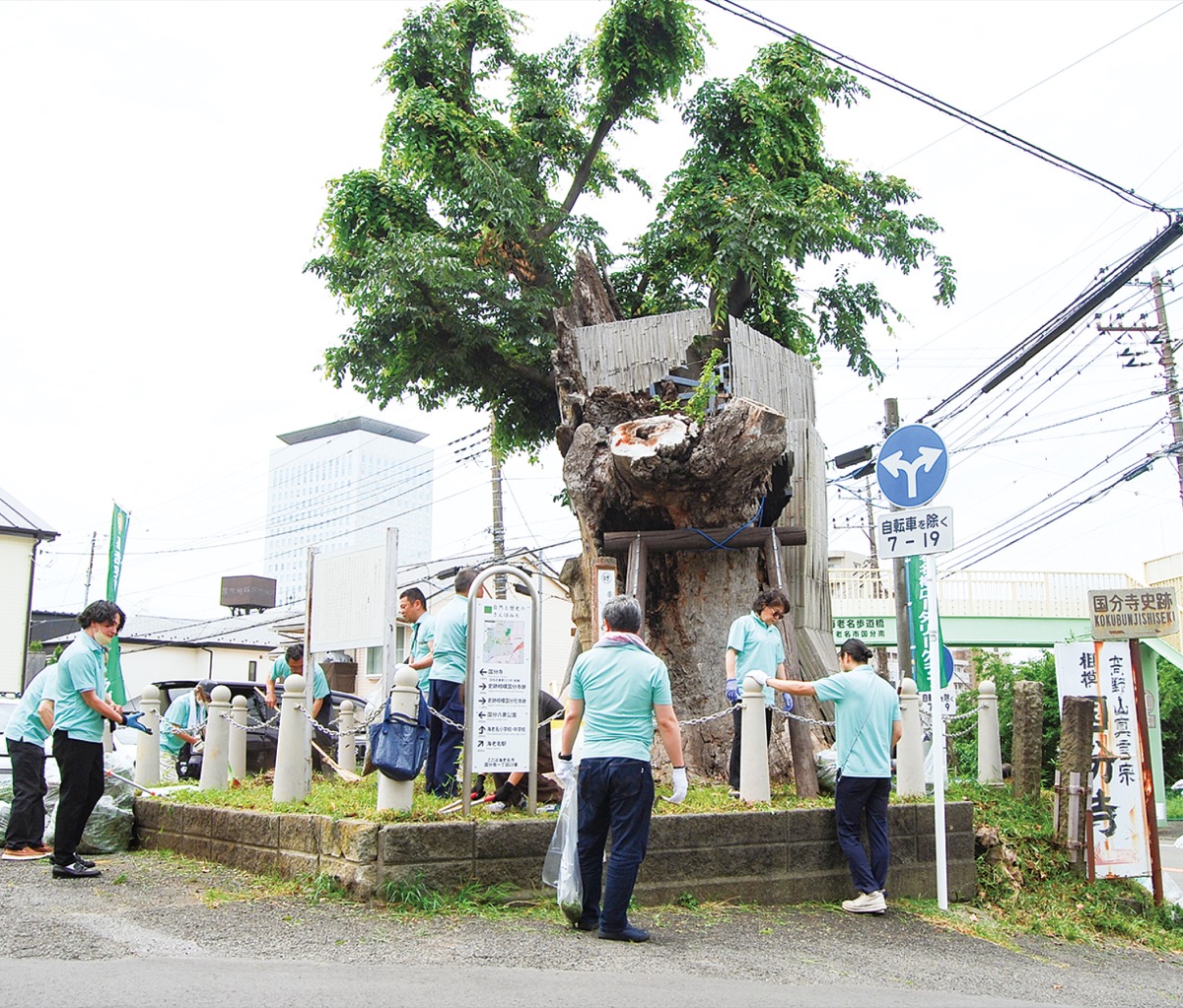 同クラブは年2回、クラブ名の由来となる大ケヤキの清掃活動を約20年続けている。当日は、同クラブのメンバー25人と市の職員らが参加。大ケヤキの周りに生い茂る雑草の刈り取りなどが行われた。