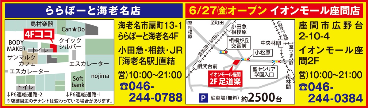 中敷と靴の専門店、足道楽プラスのイオンモール座間店が6月27日(金)午前10時にオープンする。無料の駐車場を完備し、車で出掛けるにも好都合な場所にある。
