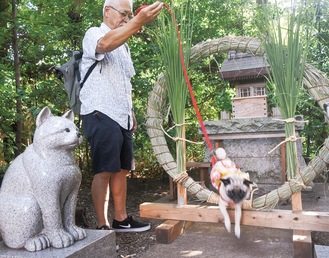 伊奴寝子社はペットの健康や幸せを願い、無事故を祈る社。愛犬のパグと小さい輪をくぐった男性(相模原市在住)は「一緒にくぐれる機会なんて、なかなかない」と声を弾ませていた。
