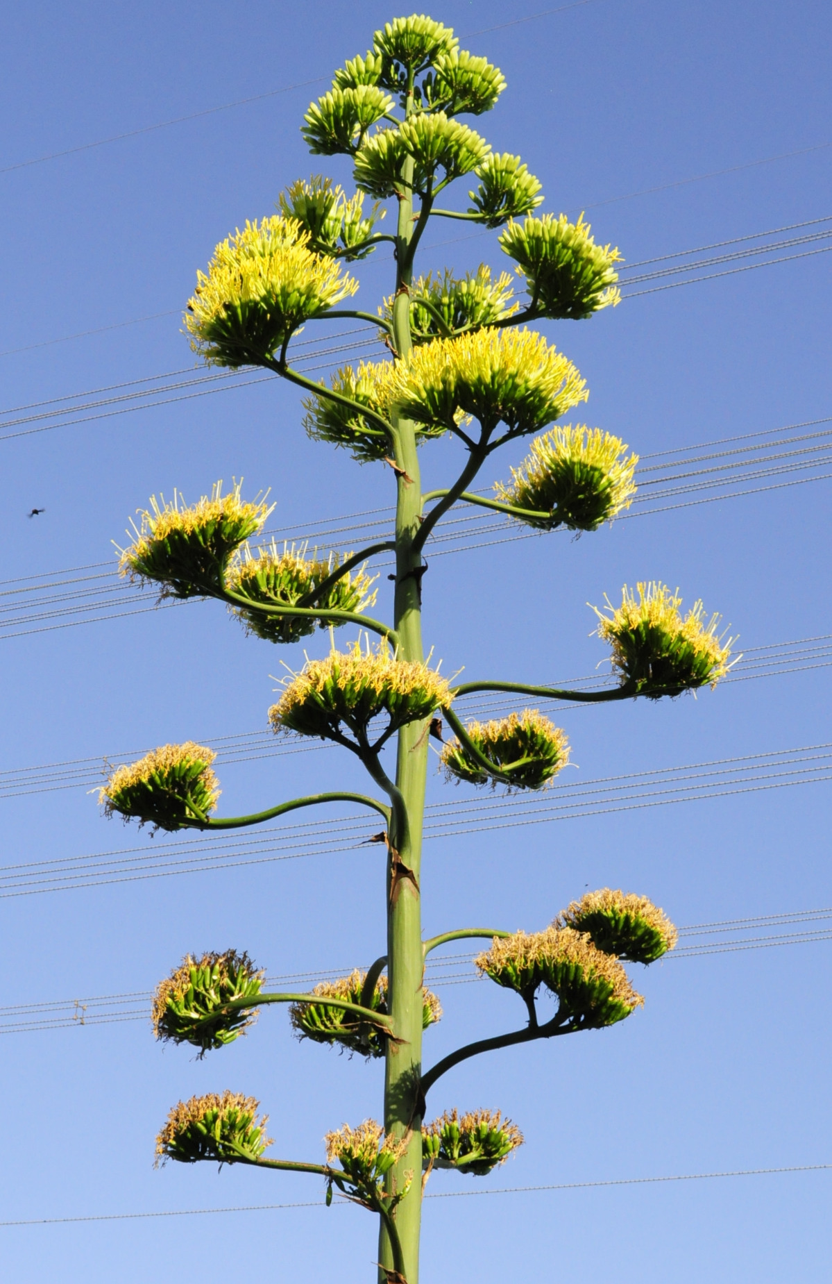 このリュウゼツランは、清水さんの祖父が50年ほど前に自宅の庭に植えたもの。大きく成長する中で、20年ほど前に現在の場所に植え替えた。4月末ごろから茎が生え始め、その後に急激な成長を見せ、現在の高さは約8メートルに及ぶ。