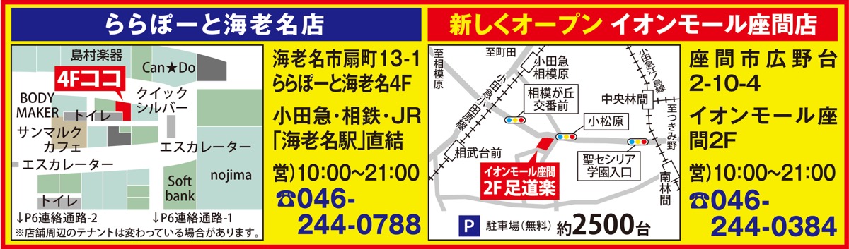 中敷と靴の専門店、足道楽プラスの「イオンモール座間店」がオープン。近隣には海老名駅前「ららぽーと海老名店」もあるので、足の悩みはどちらでも対応できる。