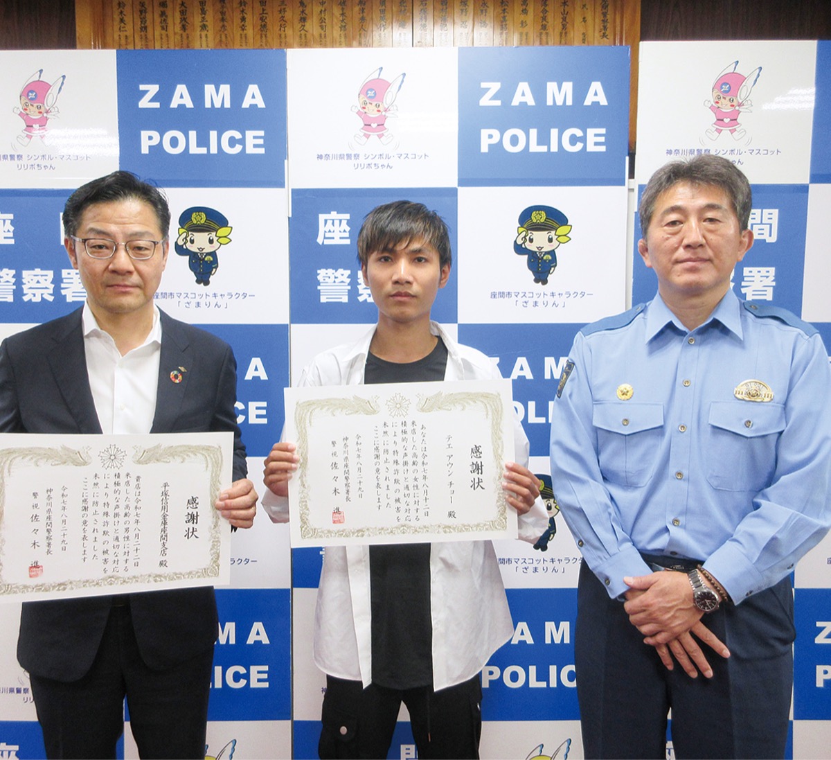 座間警察署で8月29日、声掛けなどにより特殊詐欺の被害を防いだ2者が表彰された。