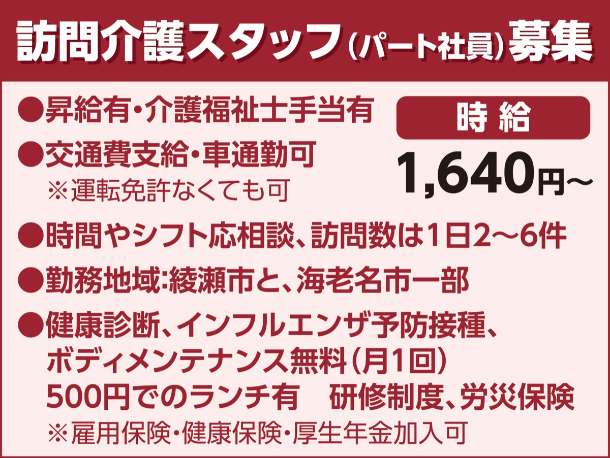 自分の生活スタイルに合わせて働きたい…という方は必見。働きやすさで定評のある『ヘルパーステーション白組』ではスタッフを募集中。週1日でも可。シフトは要望を聞いてくれるので合間に帰宅して洗濯したり、家庭の事情に合わせてくれるため、子育て中の人や、定年後の人が活躍している。初心者でも先輩が同行サポートしてくれる。訪問介護の離職率が全国平均約17〜20%という中「白組」の離職率は8・2%、定着率91・8%。安定した職場で無理なく働いてみては。応募はお気軽に左記まで。