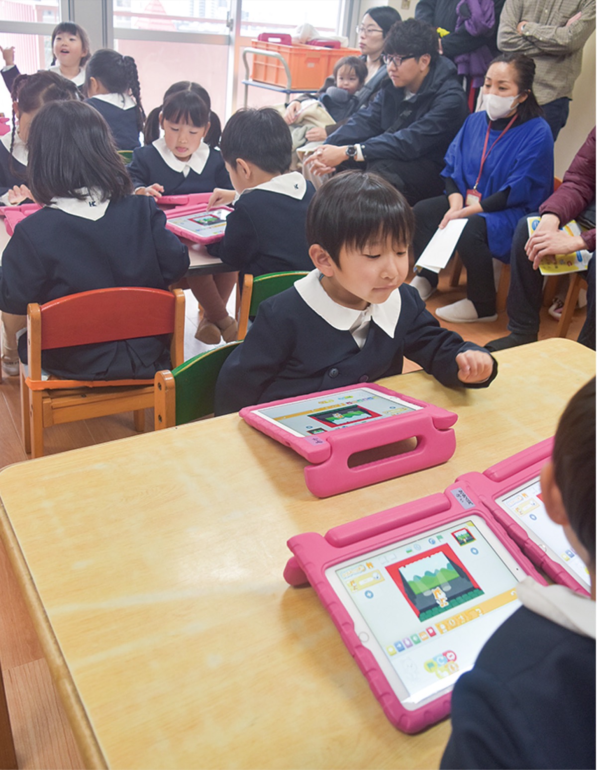 同園では年長園児全員が4年ほど前から、外部の講師を招き「正課」としてプログラミングを体験している。今回は年少・年中の課外教室の体験版として初開催したもの。のめりこむ子どもたちを保護者たちが見守っていた。