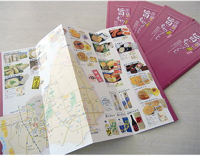 前回の「座間市特産品・推奨品パンフレット」から「旨いものづくし」に名称を改め、縦長で屏風開きとなっており、1品ずつ写真付で紹介されている。