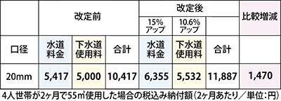 市の水道業務課がまとめた資料によれば、4人世帯の家庭(口径20㎜)が2ヶ月で55㎥使用したとすると、改定によって、水道と下水道合わせて1470円増額する(税込・2ヶ月)。