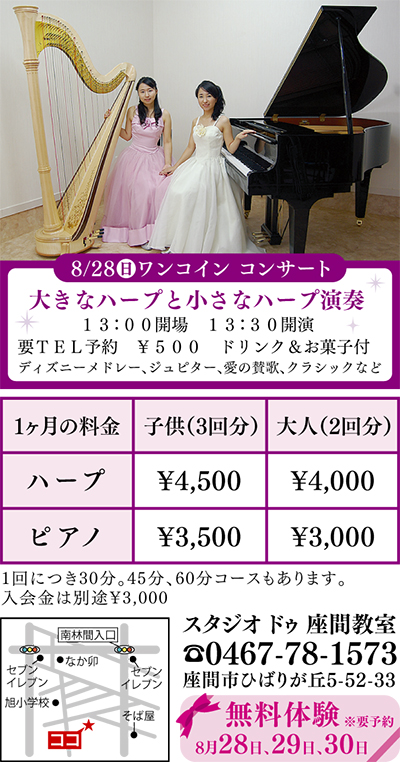 初心者でも「きらきら星」などすぐ弾けるようになるというハープ。1回のレッスン料金と間違われるほど格安の月謝に、県外からも多くの生徒が足を運ぶ。曲のレベルに関わらず受講料は一律。スタジオレンタルは1時間300円(外部の方1000円)。