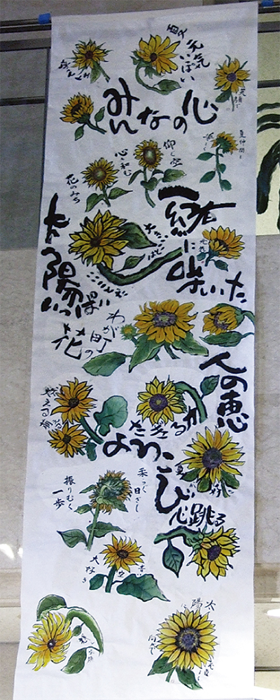 制作は、画仙紙にひまわりを配置する場所を決めるところからスタートした。このレイアウトに基づいて、画仙紙を切り取り、会員に配布。それぞれが、墨や日本画でよく使われる顔彩という道具などを使い、絵を描き上げた。集まった絵を同じサイズの画仙紙に貼り付け、さらに、村上さんの絵手紙の先生にあたる森千景さんが「太陽いっぱい」「みんなの心」なとのメッセージを書き込み、完成した。