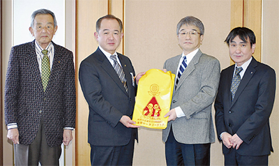 1996年から毎年、カバーの寄贈を続けている同クラブ。この日は櫻田会長と、会員の瀬戸宏孝さん、江成陽一さんが市役所を訪れ、「子どもたちの交通安全のために役立ててください」と遠藤三紀夫市長にカバーを手渡した。