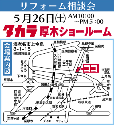場所は、タカラスタンダード厚木ショールーム(海老名市上今泉)地図参照。