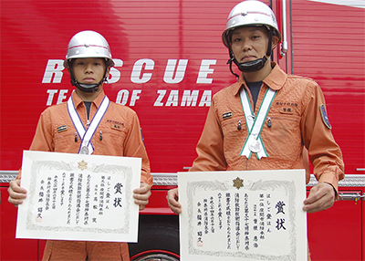 6月13日に厚木市で開かれた「県消防救助技術指導会」のはしご登はん部門で、座間市消防本部の曽根恵治隊員(27)と高松寛隊員(24)が、それぞれ1位と3位に輝いた。曽根隊員は県代表として、8月に開かれる全国消防救助技術大会への出場が決まった。