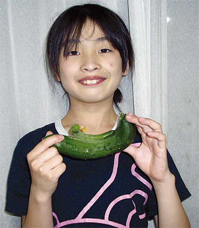 座間市入谷の齋藤さんの家庭菜園で、1本に2つの実が成ったきゅうりが収穫された。次女の美雪ちゃん(小学校4年生)が、6月10日に発見した。