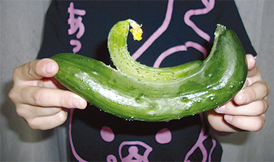 齋藤さんによると、5月上旬に苗を植え、下旬から収穫を始めた。このきゅうりは、芽が出始めたときは1カ所から3本の雌花が出ていたそう。育つにつれ2本の花となり、2つのきゅうりがくっつくような形となった。このようなかたちは他にはなかった。庭の畑では、かぼちゃやとうもろこし、トマトなども一緒に無農薬で育てている。