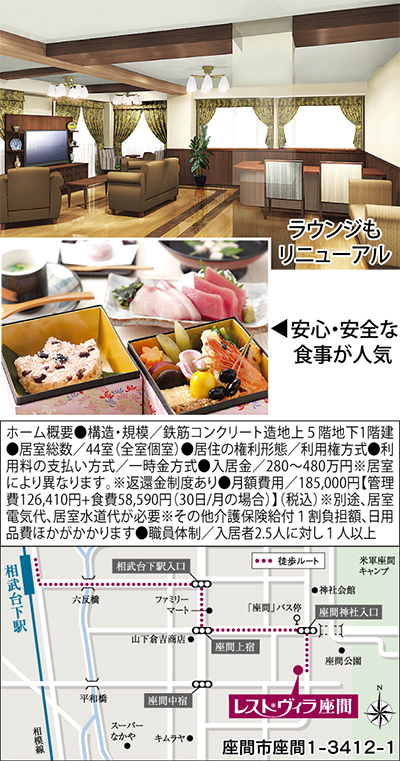 全国に87の介護付有料老人ホームを展開するワタミの介護(株)の「レストヴィラ座間」が、さらに入居しやすいホームを目指して価格を改定。入居一時金がこれまでの580万円から280万円(居室Aタイプの場合)他に見直された。さらに入居者がもっと安心、快適に利用できるよう多目的ホールやラウンジなどを改装し、7月にリニューアルオープン。現在、同ホームではリニューアルオープンしたばかりのホームを見学できる現地見学会を開催している。
