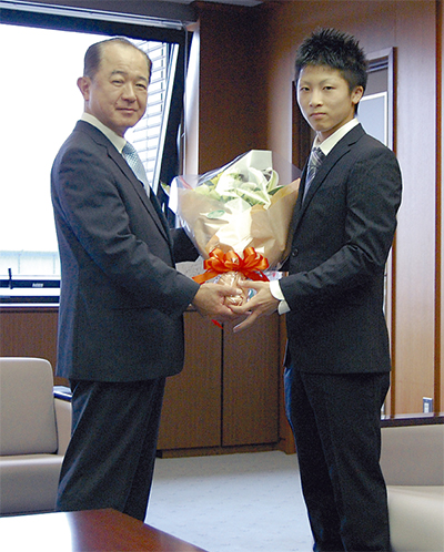 アマチュアボクシングで高校生史上初の7冠を達成し、7月11日にプロテストに合格した、栗原中央在住の井上尚弥選手(19歳)が20日、遠藤三紀夫市長を表敬訪問した。遠藤市長から激励を受け、井上選手はプロでの活躍を誓った。