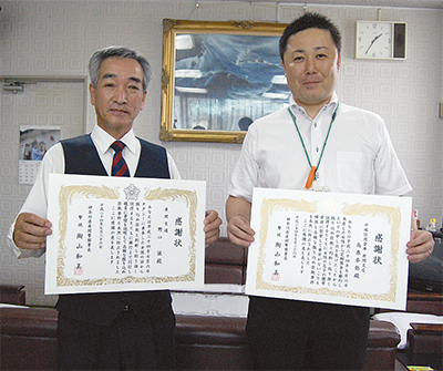 陶山署長から感謝状を受け取った野口さんは「社会問題の振り込め詐欺を防げてよかった」と話した。高桑さんは「野口さんが事前に話を聞いてくれていたのが、(防止に)大きかったです」とコメントした。