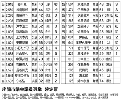 新人は、政党系も含めて9人が当選。4年前の選挙(4人)より2倍以上となった。また、全体の得票数で見ても、芥川薫氏(2915票)が1位、松橋淳郎氏(2559票)が2位、荻原健司氏(2203票)が4位と上位を占めた。