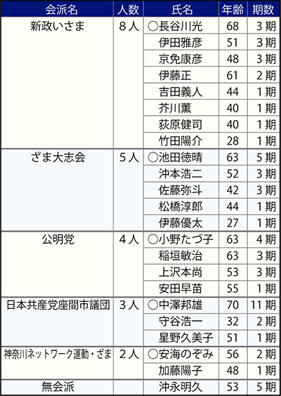 公明党、日本共産党座間市議団、神奈川ネットワーク運動・ざまはそれぞれ、改選前の人数を維持した。市民の党の沖永明久氏は、会派に属さず行動する。