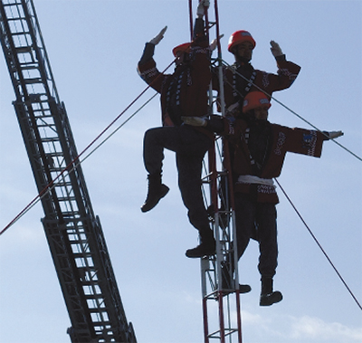 江戸時代に生まれたとされる「はしご乗り」。消防職員が高さ約9mのはしごの上で、「1本遠見」「しゃちほこ」「つまどめ」「いのち」などの演技を披露する。今年は消防署、消防団、立野台地区女性消防隊、基地管理隊、第4施設群、警察署が合同で行う。
