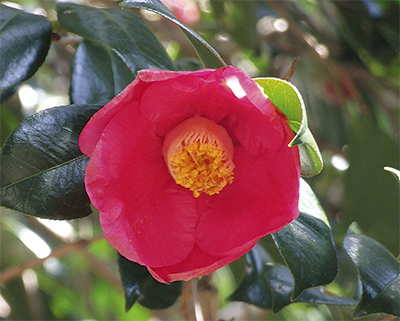 鈴野俊夫さん宅(栗原1756の3)の一角にある椿。鈴野さんによると、例年は2月下旬から花を咲かせ3月上旬まで見ごろが続く。今年は、寒い日が続いた影響からかつぼみの成長が遅れ、3月7日頃に初めて花が咲いたという。