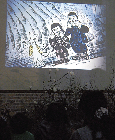 この日は版画家の佐藤國男さんが、宮澤賢治の「ゆきわたり」を題材に製作した作品を上映。兄妹とキツネの心通う交流が、幻灯機ならではの温もりある映像で描かれ、観客は見入っていた。初めて幻灯機の映像を見たという佐竹久美子さんは「版画の立体感が表現されていて、柔らかく吸い込まれそうな映像でした」と感心していた。