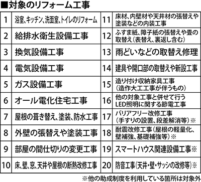対象となる工事は住宅部分のみで、外構、車庫や倉庫、併用住宅の店舗部分は対象外(左記)。市や南関東防衛局による各所補助制度との併用はできない。