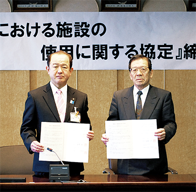 調印した遠藤三紀夫市長は「一時収容施設は災害時の課題の一つ。貴重な協定を締結させていただいた」と感謝を伝えた。