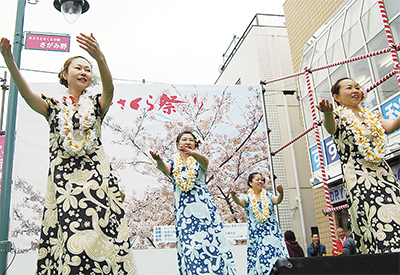 3月上旬に完成したばかりの「街のガーデン」を会場に行われた。さがみ野さくら祭りは、総勢44組約600人という出演者の豪華さが人気で、30日はフラダンスやヒップホップダンス、津軽三味線など多彩なステージが繰り広げられた。