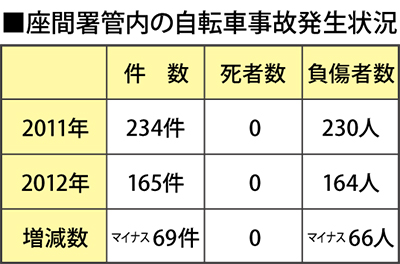 2012年の県平均は23・2%。座間市は、全事故620件のうち165件が自転車関連で、構成率26・6%だった。最も高かかったのは川崎区で39・3%。
