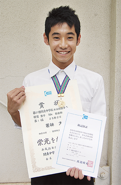 8月9日と10日に横浜国際プールで開かれた「関東中学校水泳競技大会」の50m自由形に、座間市立西中学校3年の若林大樹さんが出場した。予選と決勝で大会記録を2度更新し、優勝を果たした。
