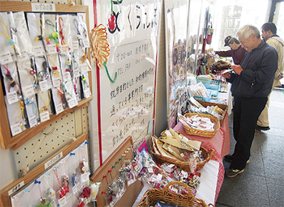 市内12の障がい者施設からなる座間市小規模障害者施設等連絡協議会らが、施設利用者が手掛けたオリジナル製品を、きょう6日まで座間市役所で販売している。会場の1階アトリウムには、ストラップやニット製品、焼き菓子などが並べられた。