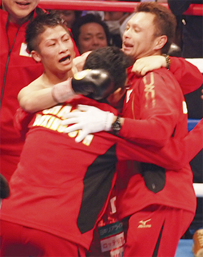 レフェリーが試合を止め、王座奪取が決まった瞬間、井上選手は喜びを爆発させ、リングに倒れ込んだ。トレーナーの父・真吾さん、同ジムの大橋秀行会長、松本好二チーフトレーナーらと抱き合う。真吾さんに担がれると、サポーターがいる観客席へガッツポーズ。普段冷静な井上選手が感情をむき出しに喜んだ。それだけ大きな一戦だった。