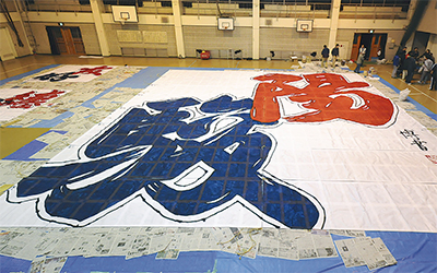 今年の凧文字は、小松原の成田典男さんが考案した「陽駿」。生物が生きる上で欠かせない太陽の「陽」と、2014年の干支・午(うま)にちなんだ「駿」を組み合わせた言葉。市民から寄せられた33点から選ばれた。