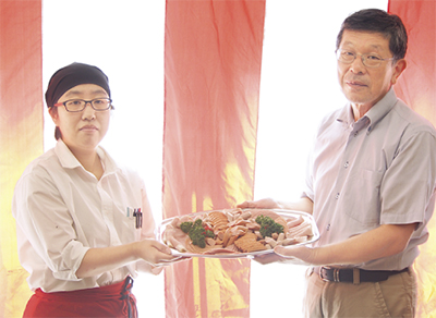 (株)高座豚手造りハム(=本店・綾瀬市吉岡/志澤菜穗子代表)が13日、敬老の日を前に特別養護老人ホーム「第二座間苑」を訪れ、ハムやソーセージなどを盛りあわせたオードブル5皿を贈呈した。